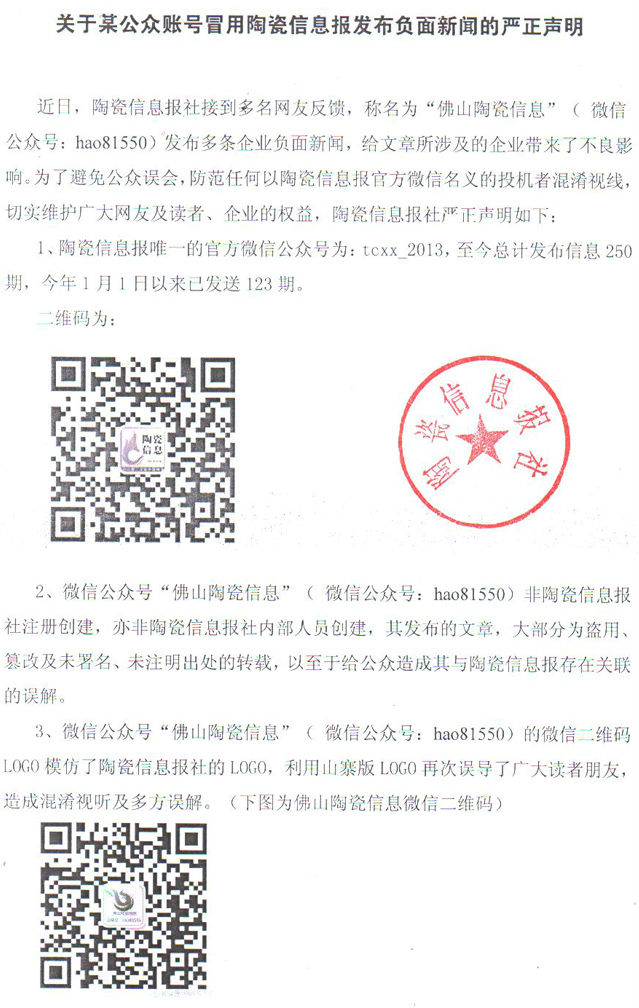 2、微信公众号“佛山陶瓷信息”(微信公众号:hao81550)非陶瓷信息注册创建,亦非陶瓷信息内部人员创建,其发布的文章,大部分为盗用、篡改及未署名、未注明出处的转载,以至于给公众造成其与陶瓷信息存在关联的误解。