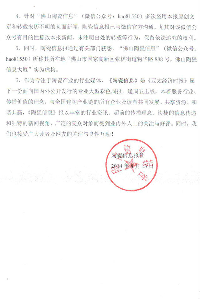 4、针对“佛山陶瓷信息”(微信公众号:hao81550)多次盗用陶瓷信息原创文章和转载来历不明的负面新闻,陶瓷信息已与微信官方沟通。尤其对该微信公众号有目的性篡改陶瓷信息新闻、未注明出处的转载等行为,保留依法追究的权利。