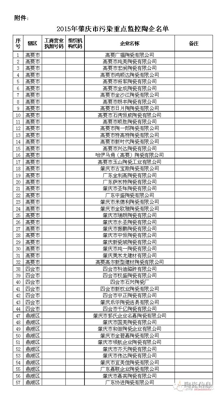 肇庆市的玻璃生产、陶瓷、纺织印染等企业均被列入名单,其中陶瓷生产企业57家。按照要求,重点排污单位除公开基础信息外,还需公开每半年更新排污信息,包括主要污染物及特征污染物的名称、排放方式、排放口数量和分布情况、排放浓度和总量、超标情况,以及执行的污染物排放标准、核定的排放总量;防治污染设施的建设和运行情况;建设项目环境影响评价及其他环境保护行政许可情况;突发环境事件应急预案等。而列入国家重点监控企业名单的重点排污单位还应当公开其环境自行监测方案。