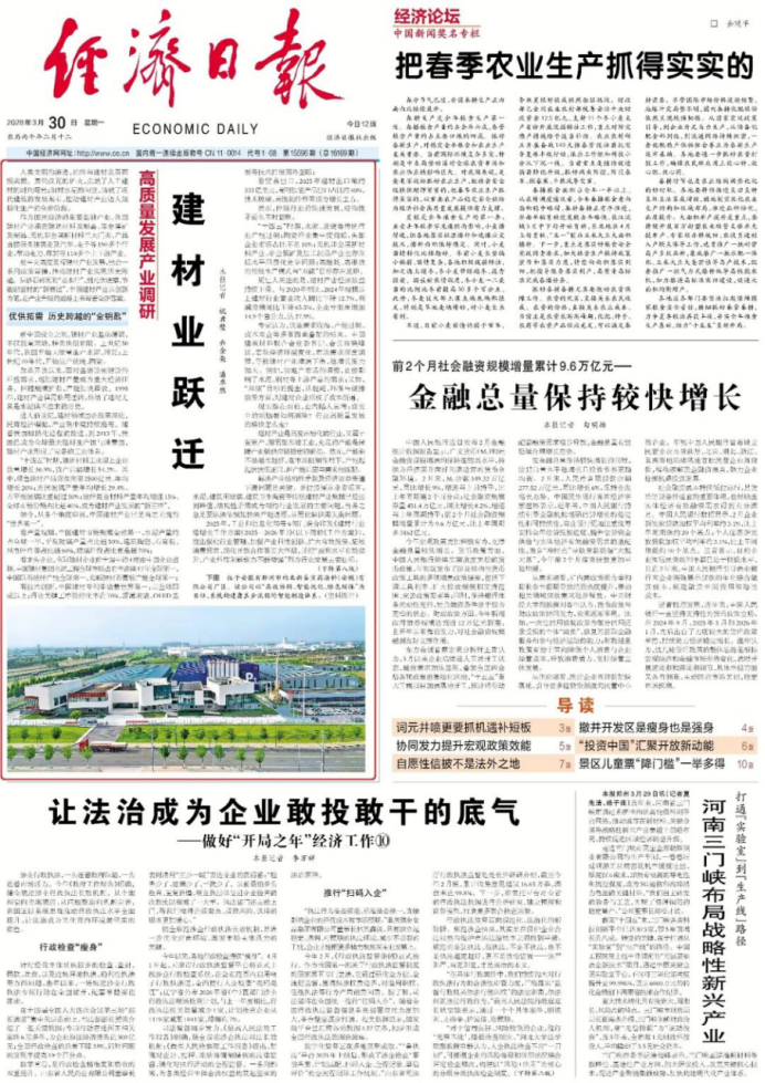 3月30日,《经济日报》头版推出“高质量发展产业调研——建材业跃迁”重磅文章,对我国建材行业从智能制造、绿色低碳、材料创新等多维度进行了全景式的报道,其中蒙娜丽莎集团(蒙娜丽莎瓷砖、QD瓷砖、美尔奇岩板)作为典型案例被多次引用,充分肯定了蒙娜丽莎集团在建材行业高质量发展当中的担当与引领作用。